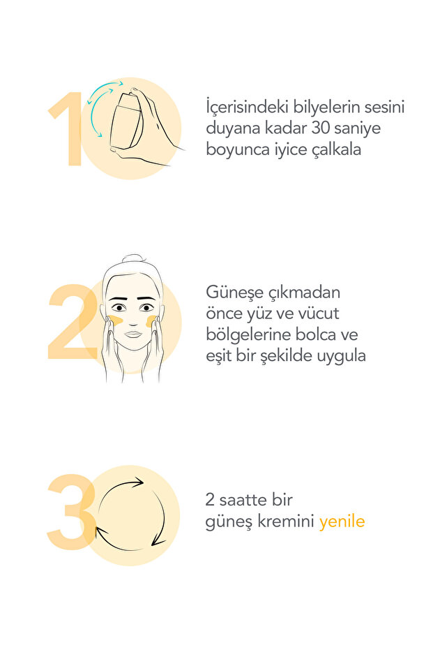 İçerisindeki bilyelerin sesini duyana kadar iyice çalkalayınız. Güneşe çıkmadan önce bolca ve eşit miktarda uygulayını. Yüz ve vücut kullanımına uygundur.  2 saatte bir özellikle yüzme ve kurulanma sonrasında tekrarlayınız. 6 aydan itibaren bebeklerin, çocukların ve yetişkinlerin kullanımına uygundur.