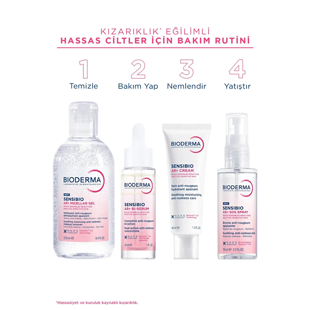 Sensibio AR+ Misel Jel ve/veya Sensibio Foaming Gel ile önceden temizlenmiş cildinize ve boynunuza sabah ve/veya akşam birkaç damla uygulayın. Sensibio AR+ Cream ile cilt bakım rutininizi tamamlayın. Kullanmadan önce iyice çalkalayın.