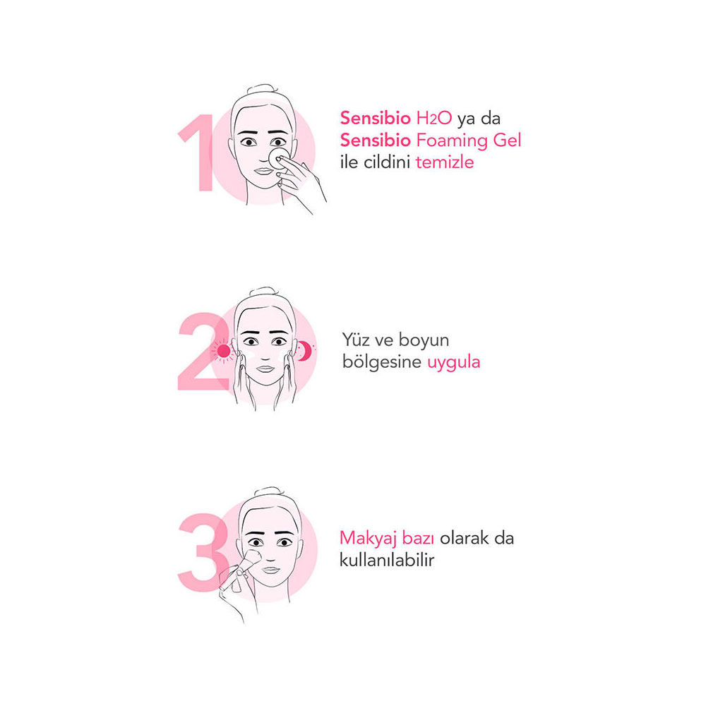 Sensbio H2O ve/veya Sensibio Foaming Gel ile önceden temizlenmiş yüz ve boyun bölgesine günde 1 veya 2 kez uygulanabilir. Makyaj bazı olarak da kullanılabilir.