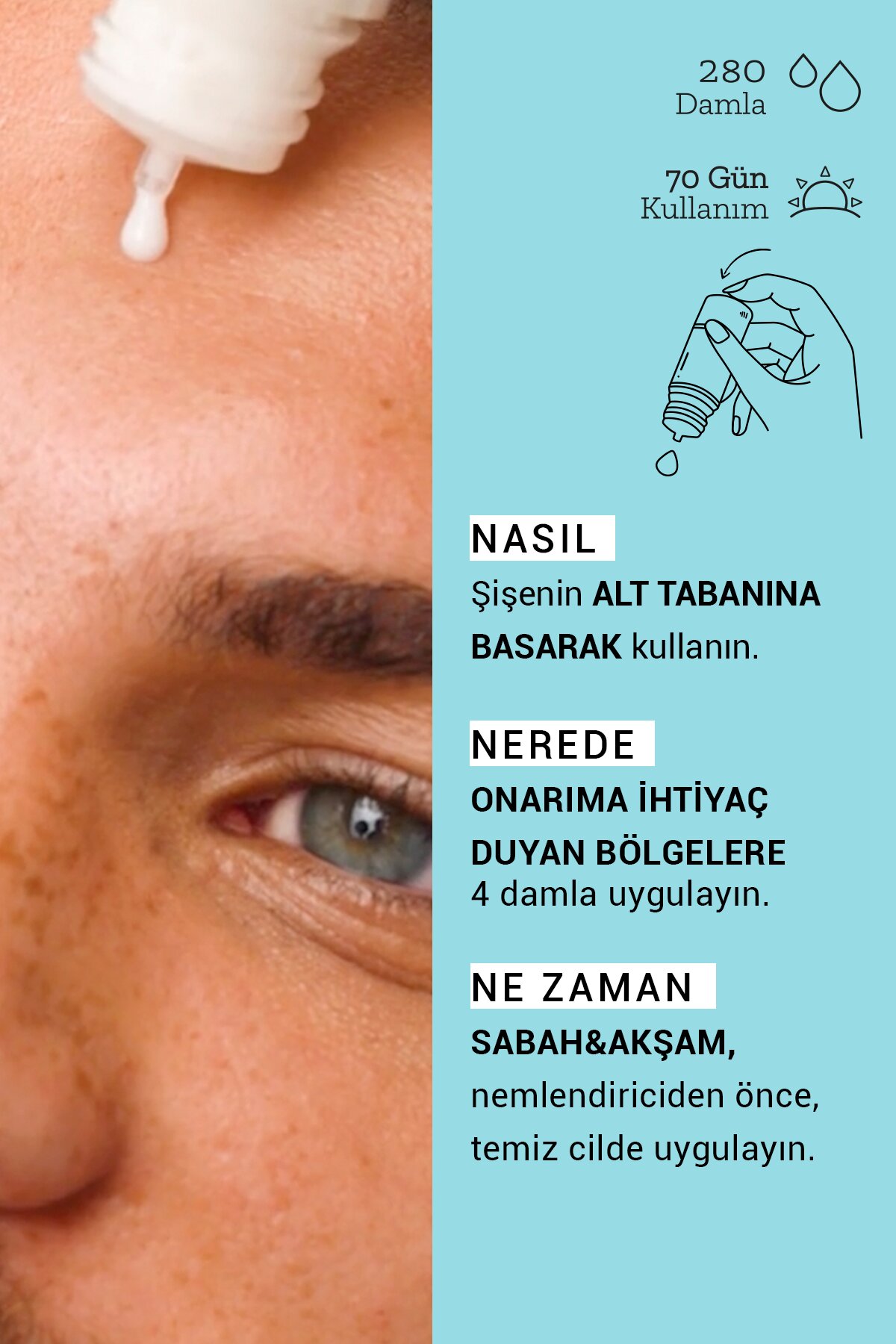 Şişenin alt bölümüne basarak damlatınız. 4 damla olarak yüz çevresine uygulanır. Gündüz ve gece bakım kreminden önce uygulanır.