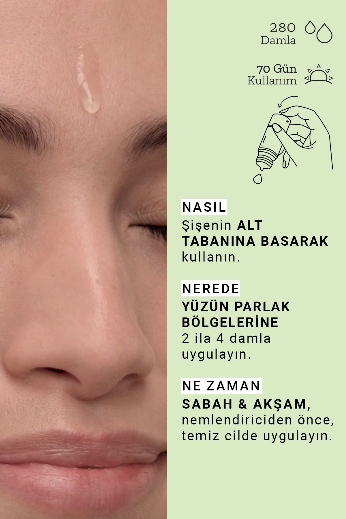 Şişenin alt bölümüne basarak damlatınız. En az 2, en fazla 4 damla olacak şekilde yüzde parlayan bölgelere uygulayınız. Gündüz ve gece bakım kreminizden önce uygulanır.