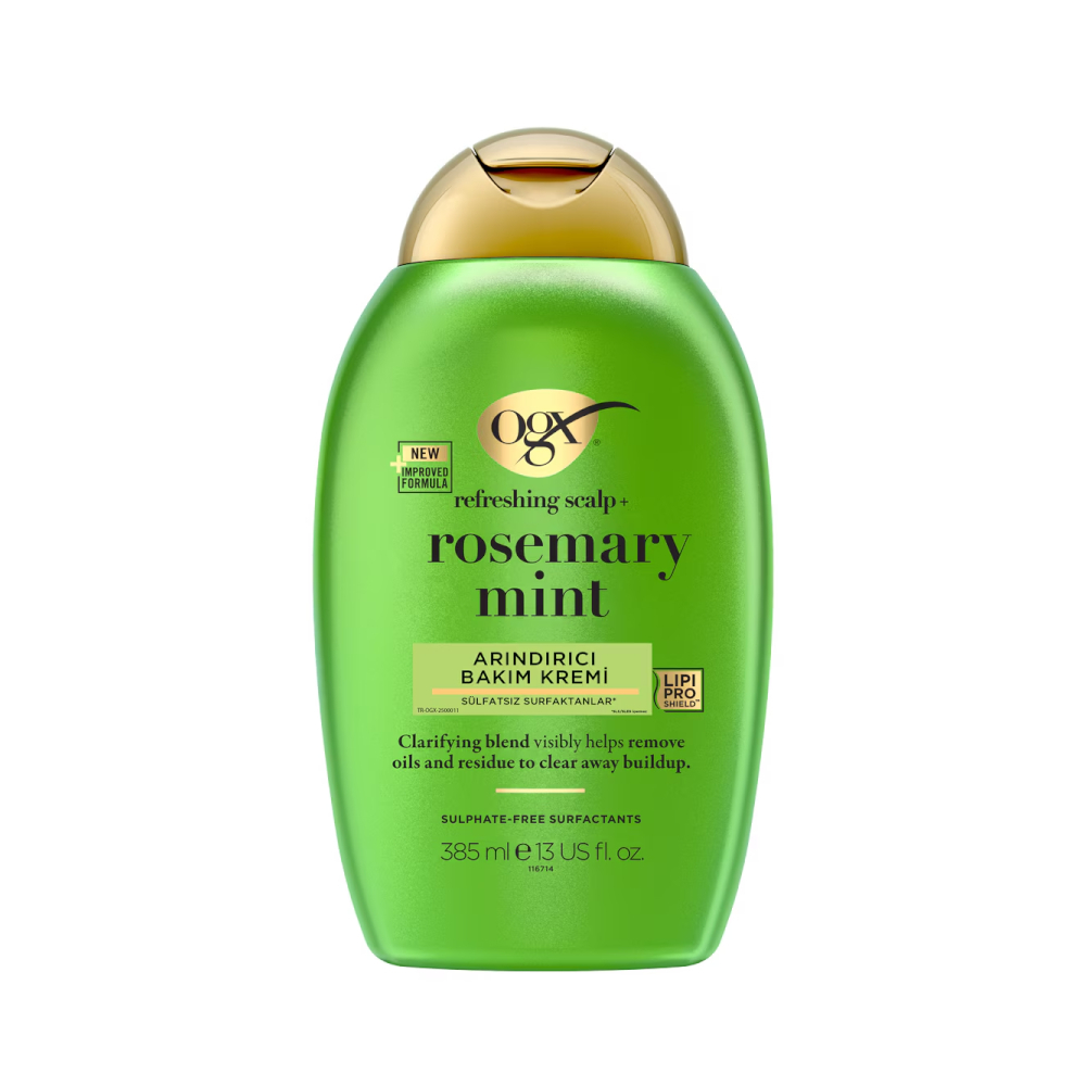OGX Rosemary Mint Refreshing Conditioner 385 ml, saç ve saç derisini ferahlatmaya yardımcı olan özel formülüyle günlük saç bakımına tazelik kazandırır. Biberiye ve nane özleri içeren formülü, saç derisine serinletici bir etki sunarken saçın daha canlı ve hacimli görünmesine destek olur. Saçı ağırlaştırmadan nemlendiren yapısı sayesinde yumuşaklık ve kolay tarama sağlar. Ferahlatıcı aroması ile duş sırasında canlandırıcı bir bakım deneyimi sunar. Sülfat içermeyen formülü saçın doğal nem dengesini korumaya yardımcı olur ve tüm saç tipleri için uygundur.