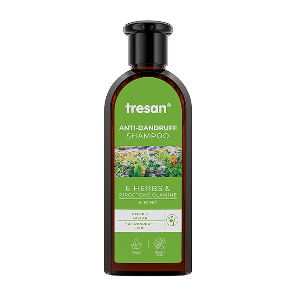 Tresan 6 Bitki Kepek Karşıtı Şampuan içeriğinde; Papatya, Kediotu, Civanperçemi, Şerbetçiotu, Melisa, Rezene bitki ekstreleri, Panthenol ve % 0,3 oranında Piroctone Olamine mevcuttur. Düzenli kullanıldığında, kafa derisinde yağ dengesini düzenleyip, kepek oluşumunun giderilmesini sağlarken, saçlara canlılık ve yumuşaklık kazandırmaya yardımcı olur.